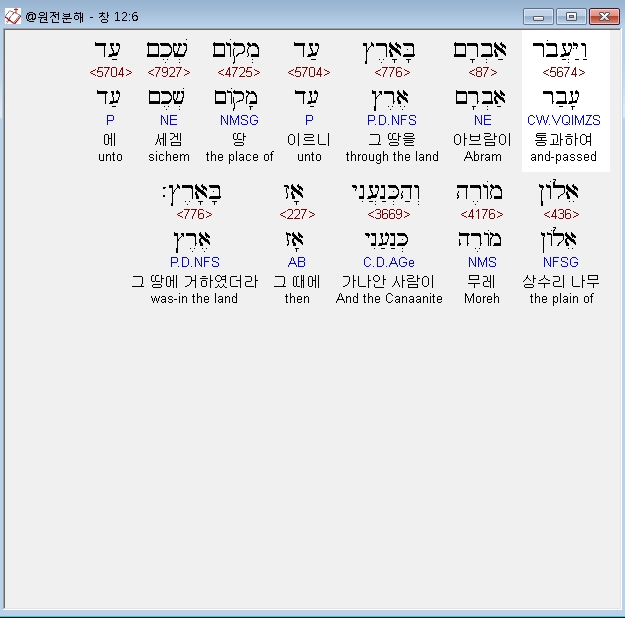 히브리어구약BHS,6 וַיַּעֲבֹר אַבְרָם בָּאָרֶץ עַד מְקֹום שְׁכֶם עַד אֵלֹון מֹורֶה וְהַכְּנַעֲנִי אָז בָּאָרֶץ׃