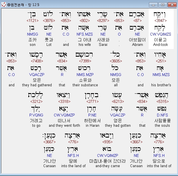 히브리어구약BHS,5 וַיִּקַּח אַבְרָם אֶת־שָׂרַי אִשְׁתֹּו וְאֶת־לֹוט בֶּן־אָחִיו וְאֶת־כָּל־רְכוּשָׁם אֲשֶׁר רָכָשׁוּ וְאֶת־הַנֶּפֶשׁ אֲשֶׁר־עָשׂוּ בְחָרָן וַיֵּצְאוּ לָלֶכֶת אַרְצָה כְּנַעַן וַיָּבֹאוּ אַרְצָה כְּנָעַן׃