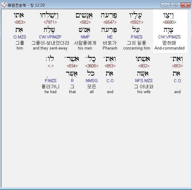 히브리어구약BHS,20 וַיְצַו עָלָיו פַּרְעֹה אֲנָשִׁים וַיְשַׁלְּחוּ אֹתֹו וְאֶת־אִשְׁתֹּו וְאֶת־כָּל־אֲשֶׁר־לֹו׃
