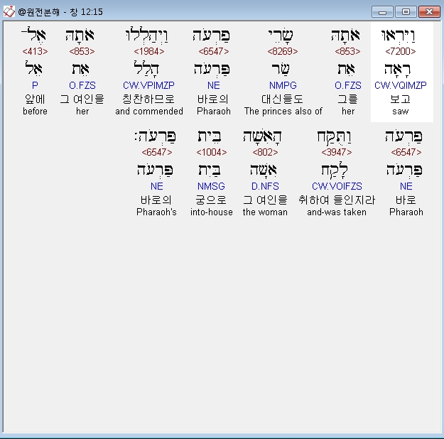 히브리어구약BHS,15 וַיִּרְאוּ אֹתָהּ שָׂרֵי פַרְעֹה וַיְהַלְלוּ אֹתָהּ אֶל־פַּרְעֹה וַתֻּקַּח הָאִשָּׁה בֵּית פַּרְעֹה׃