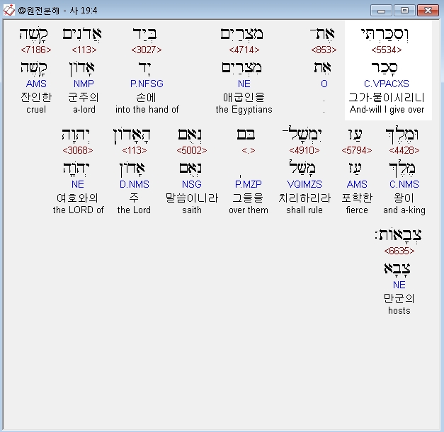 히브리어구약BHS,4 וְסִכַּרְתִּי אֶת־מִצְרַיִם בְּיַד אֲדֹנִים קָשֶׁה וּמֶלֶךְ עַז יִמְשָׁל־בָּם נְאֻם הָאָדֹון יְהוָה צְבָאֹות׃