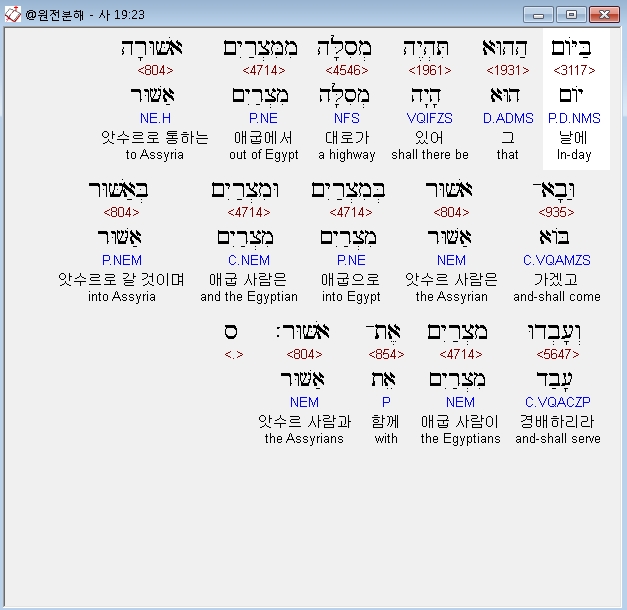개역개정,23 그 날에 애굽에서 앗수르로 통하는 대로가 있어 앗수르 사람은 애굽으로 가겠고 애굽 사람은 앗수르로 갈 것이며 애굽 사람이 앗수르 사람과 함께 경배하리라