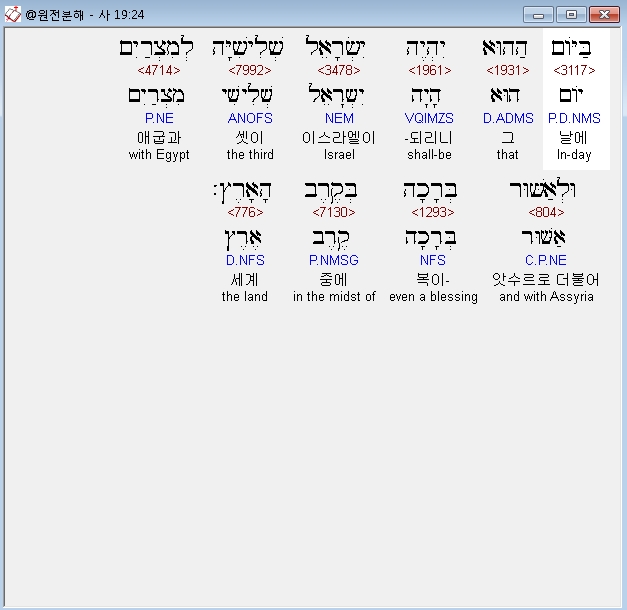 히브리어구약BHS,24 בַּיֹּום הַהוּא יִהְיֶה יִשְׂרָאֵל שְׁלִישִׁיָּה לְמִצְרַיִם וּלְאַשּׁוּר בְּרָכָה בְּקֶרֶב הָאָרֶץ׃