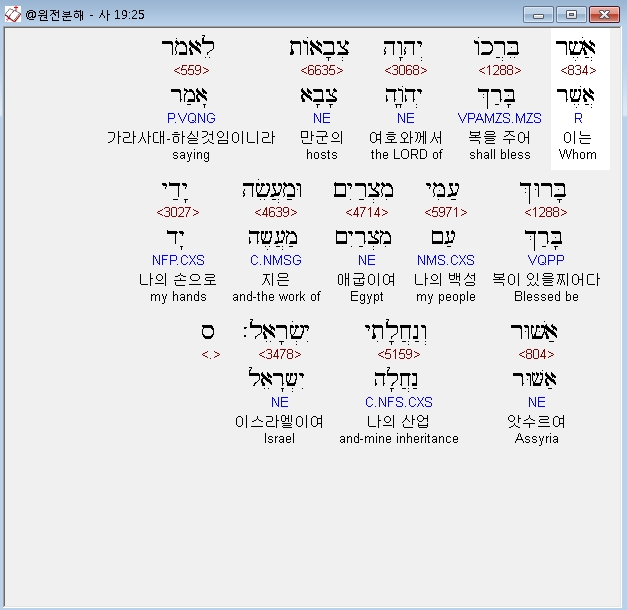 히브리어구약BHS,25 אֲשֶׁר בֵּרֲכֹו יְהוָה צְבָאֹות לֵאמֹר בָּרוּךְ עַמִּי מִצְרַיִם וּמַעֲשֵׂה יָדַי אַשּׁוּר וְנַחֲלָתִי יִשְׂרָאֵל׃ ס