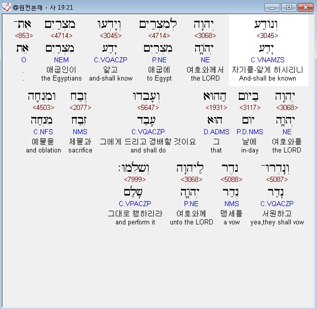 히브리어구약BHS,21 וְנֹודַע יְהוָה לְמִצְרַיִם וְיָדְעוּ מִצְרַיִם אֶת־יְהוָה בַּיֹּום הַהוּא וְעָבְדוּ זֶבַח וּמִנְחָה וְנָדְרוּ־נֵדֶר לַיהוָה וְשִׁלֵּמוּ׃