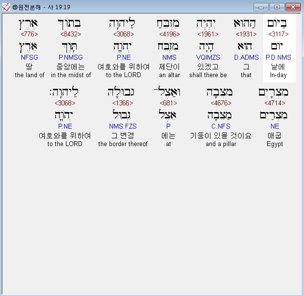 히브리어구약BHS,19 בַּיֹּום הַהוּא יִהְיֶה מִזְבֵּחַ לַיהוָה בְּתֹוךְ אֶרֶץ מִצְרָיִם וּמַצֵּבָה אֵצֶל־גְּבוּלָהּ לַיהוָה׃