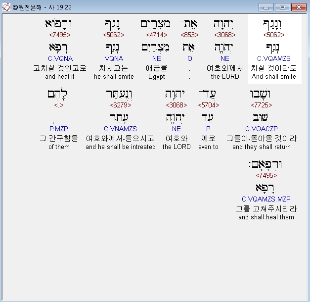 히브리어구약BHS,22 וְנָגַף יְהוָה אֶת־מִצְרַיִם נָגֹף וְרָפֹוא וְשָׁבוּ עַד־יְהוָה וְנֶעְתַּר לָהֶם וּרְפָאָם׃