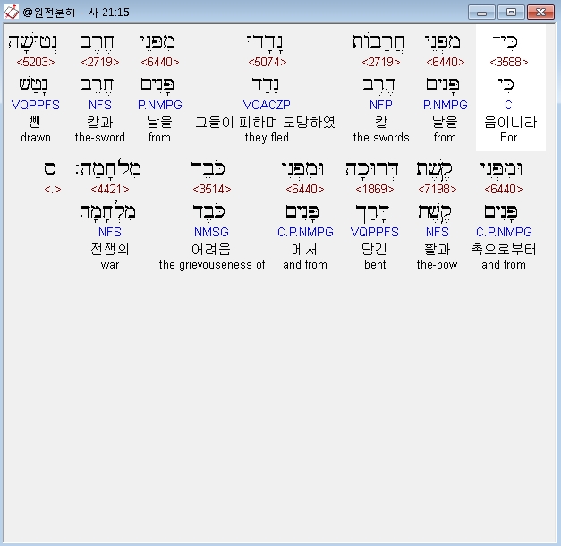 히브리어구약BHS,15 כִּי־מִפְּנֵי חֲרָבֹות נָדָדוּ מִפְּנֵי חֶרֶב נְטוּשָׁה וּמִפְּנֵי קֶשֶׁת דְּרוּכָה וּמִפְּנֵי כֹּבֶד מִלְחָמָה׃ ס
