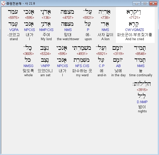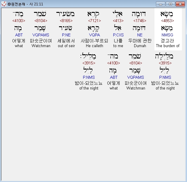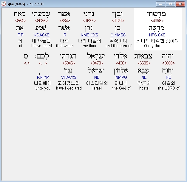 | 히브리어 이사야 22장 전체 원어 원문 성경 공부 주석 강해 설교 해설 해석 (0) | 2020.10.16 |