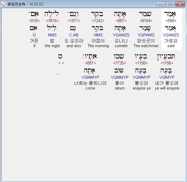 히브리어구약BHS,12 אָמַר שֹׁמֵר אָתָה בֹקֶר וְגַם־לָיְלָה אִם־תִּבְעָיוּן בְּעָיוּ שֻׁבוּ אֵתָיוּ׃ ס