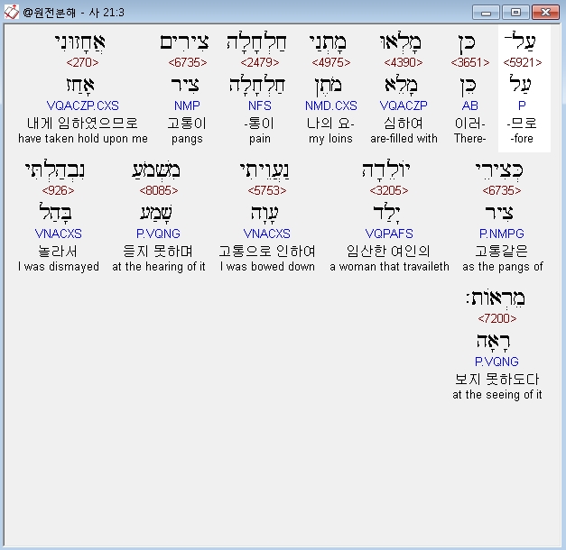 히브리어구약BHS,3 עַל־כֵּן מָלְאוּ מָתְנַי חַלְחָלָה צִירִים אֲחָזוּנִי כְּצִירֵי יֹולֵדָה נַעֲוֵיתִי מִשְּׁמֹעַ נִבְהַלְתִּי מֵרְאֹות׃