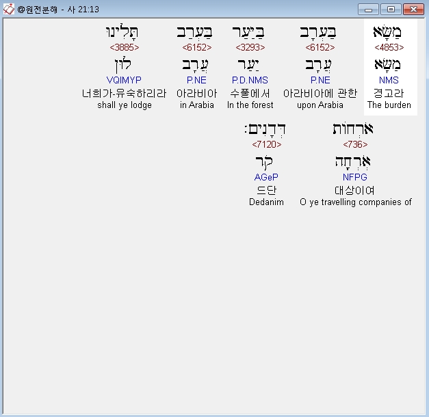 아라비아에 관한 경고라 - 바벨론의 파멸은 에돔뿐만 아니라 인접한 아리비아에까지 영향을 미친다. '아라비아'(*,아라브)라는 이름에는, '해변광야', '두마'와 같이 그 나라의 운명을 암시하는 '저녁'이라는 상징적 뜻이 담겨 있다. 그의 구성은 대단히 기교적이다. 세일 산지를 뒤덮은 어둠(12절)은 아라비아에도 어어져 뜨거운 태양 아래 대상들이 자유로이 왕래하던 나라 아라비아는 이름 그대로 저녁의 땅이 될 것이다.