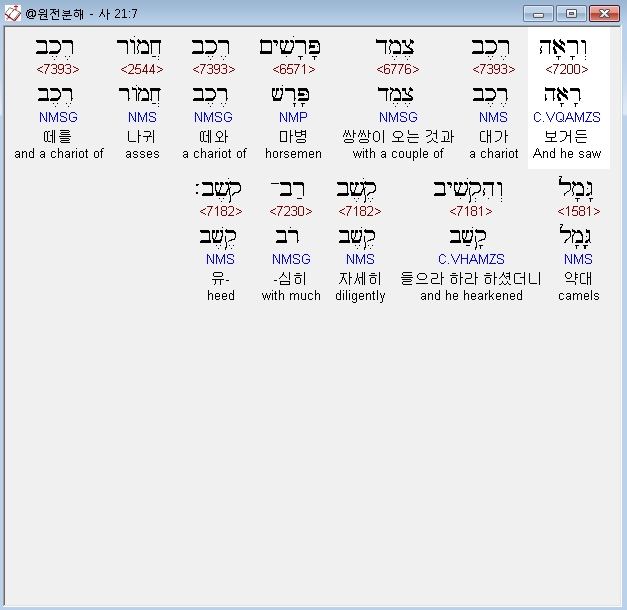 헬라어구약Septuagint,7 και ειδον αναβατας ιππεις δυο αναβατην ονου και αναβατην καμηλου ακροασαι ακροασιν πολλην