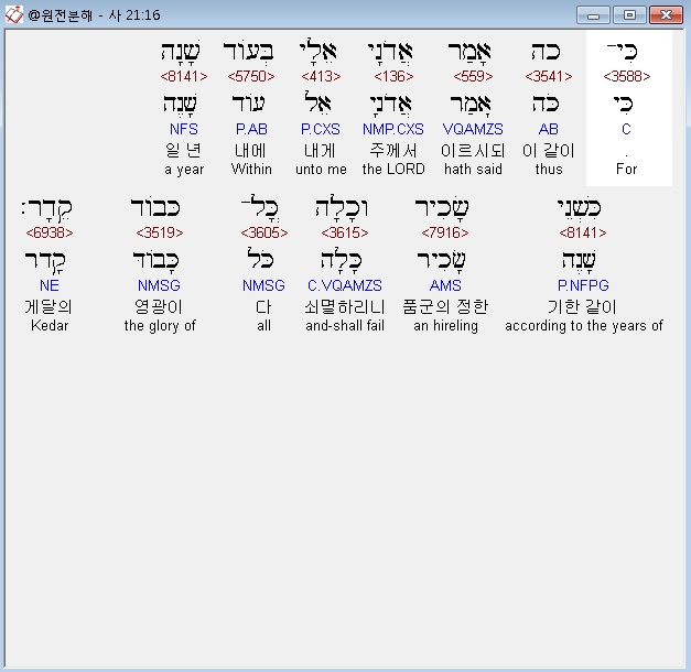 히브리어구약BHS,16 כִּי־כֹה אָמַר אֲדֹנָי אֵלָי בְּעֹוד שָׁנָה כִּשְׁנֵי שָׂכִיר וְכָלָה כָּל־כְּבֹוד קֵדָר׃