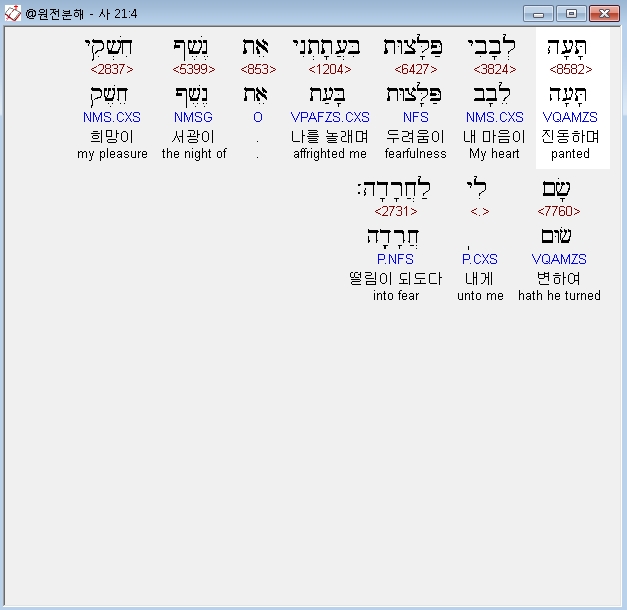 히브리어구약BHS,4 תָּעָה לְבָבִי פַּלָּצוּת בִּעֲתָתְנִי אֵת נֶשֶׁף חִשְׁקִי שָׂם לִי לַחֲרָדָה׃