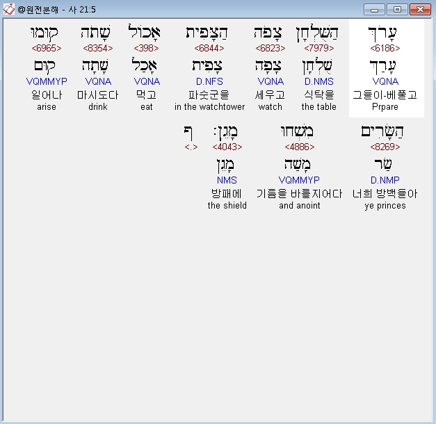 히브리어구약BHS,5 עָרֹךְ הַשֻּׁלְחָן צָפֹה הַצָּפִית אָכֹול שָׁתֹה קוּמוּ הַשָּׂרִים מִשְׁחוּ מָגֵן׃ ף