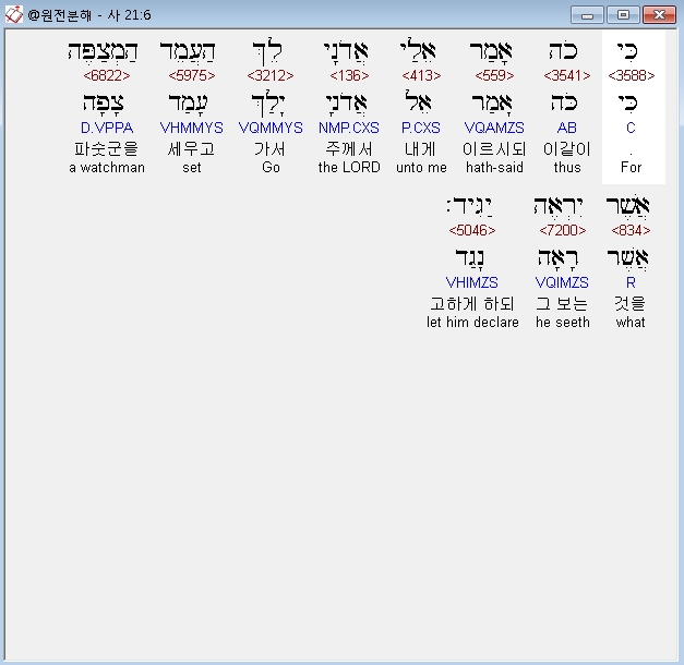 히브리어구약BHS,6 כִּי כֹה אָמַר אֵלַי אֲדֹנָי לֵךְ הַעֲמֵד הַמְצַפֶּה אֲשֶׁר יִרְאֶה יַגִּיד׃