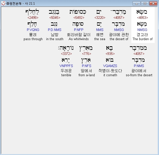 영어NASB,1 The oracle concerning the wilderness of the sea. As windstorms in the Negev sweep on, It comes from the wilderness, from a terrifying land.