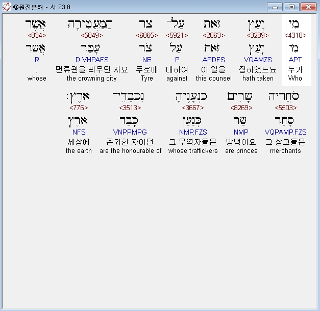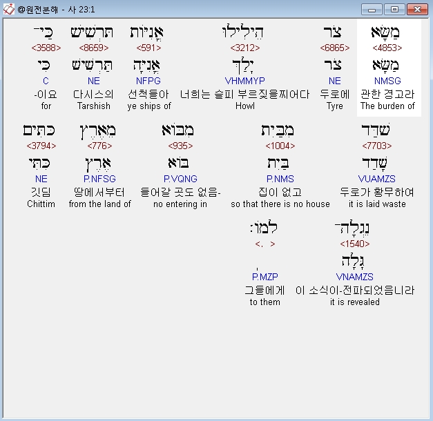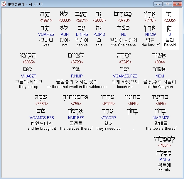 | 히브리어 이사야 22장 전체 원어 원문 성경 공부 주석 강해 설교 해설 해석 (0) | 2020.10.16 |