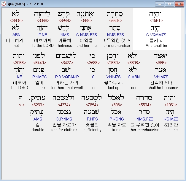 헬라어구약Septuagint,18 και εσται αυτης η εμπορια και ο μισθος αγιον τω κυριω ουκ αυτοις συναχθησεται αλλα τοις κατοικουσιν εναντι κυριου πασα η εμπορια αυτης φαγειν και πιειν και εμπλησθηναι εις συμβολην μνημοσυνον εναντι κυριου
