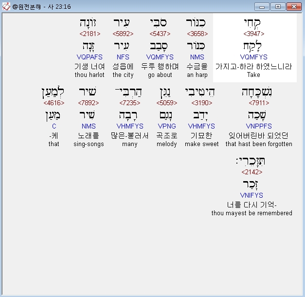 히브리어구약BHS,16 קְחִי כִנֹּור סֹבִּי עִיר זֹונָה נִשְׁכָּחָה הֵיטִיבִי נַגֵּן הַרְבִּי־שִׁיר לְמַעַן תִּזָּכֵרִי׃