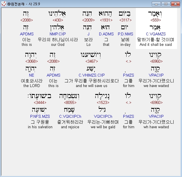 영어NASB,9 And it will be said in that day, "Behold, this is our God for whom we have waited that He might save us. This is the LORD for whom we have waited; Let us rejoice and be glad in His salvation."