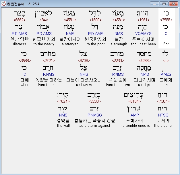 히브리어구약BHS,4 כִּי־הָיִיתָ מָעֹוז לַדָּל מָעֹוז לָאֶבְיֹון בַּצַּר־לֹו מַחְסֶה מִזֶּרֶם צֵל מֵחֹרֶב כִּי רוּחַ עָרִיצִים כְּזֶרֶם קִיר׃