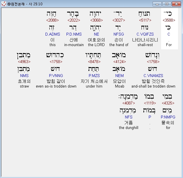 히브리어구약BHS,10 כִּי־תָנוּחַ יַד־יְהוָה בָּהָר הַזֶּה וְנָדֹושׁ מֹואָב תַּחְתָּיו כְּהִדּוּשׁ מַתְבֵּן [כ= בְּמֵי] [ק= בְּמֹו] מַדְמֵנָה׃