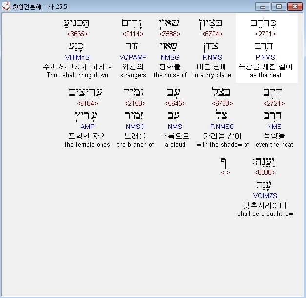 히브리어구약BHS,5 כְּחֹרֶב בְּצָיֹון שְׁאֹון זָרִים תַּכְנִיעַ חֹרֶב בְּצֵל עָב זְמִיר עָרִיצִים יַעֲנֶה׃ ף