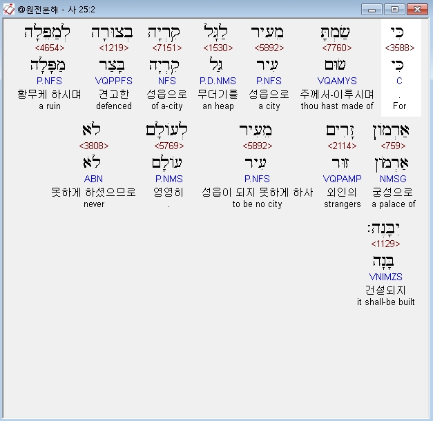 히브리어구약BHS,2 כִּי שַׂמְתָּ מֵעִיר לַגָּל קִרְיָה בְצוּרָה לְמַפֵּלָה אַרְמֹון זָרִים מֵעִיר לְעֹולָם לֹא יִבָּנֶה׃