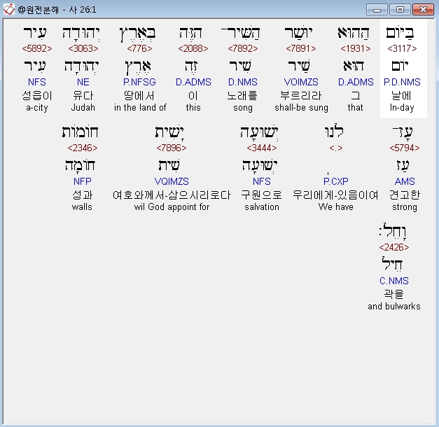 헬라어구약Septuagint,1 τη ημερα εκεινη ασονται το ασμα τουτο επι γης ιουδα λεγοντες ιδου πολις οχυρα και σωτηριον ημων θησει τειχος και περιτειχος