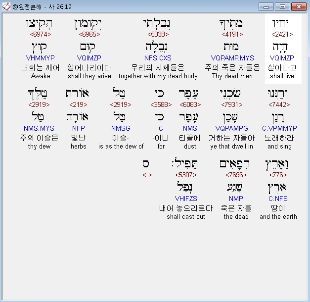 히브리어구약BHS,19 יִחְיוּ מֵתֶיךָ נְבֵלָתִי יְקוּמוּן הָקִיצוּ וְרַנְּנוּ שֹׁכְנֵי עָפָר כִּי טַל אֹורֹת טַלֶּךָ וָאָרֶץ רְפָאִים תַּפִּיל׃ ס