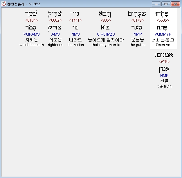 히브리어구약BHS,2 פִּתְחוּ שְׁעָרִים וְיָבֹא גֹוי־צַדִּיק שֹׁמֵר אֱמֻנִים׃