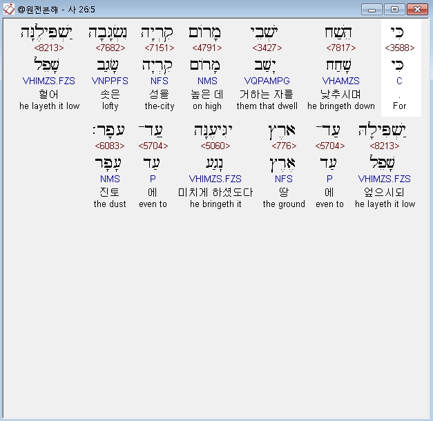 히브리어구약BHS,5 כִּי הֵשַׁח יֹשְׁבֵי מָרֹום קִרְיָה נִשְׂגָּבָה יַשְׁפִּילֶנָּה יַשְׁפִּילָהּ עַד־אֶרֶץ יַגִּיעֶנָּה עַד־עָפָר׃
