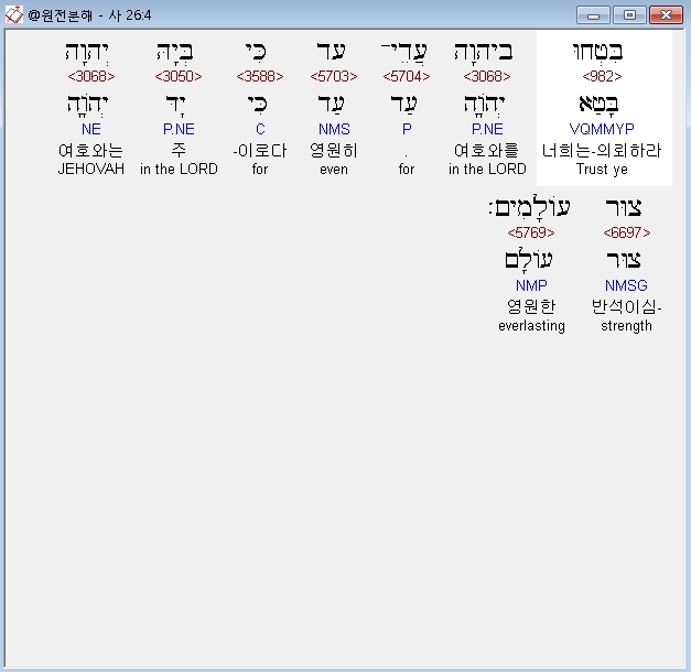 히브리어구약BHS,4 בִּטְחוּ בַיהוָה עֲדֵי־עַד כִּי בְּיָהּ יְהוָה צוּר עֹולָמִים׃