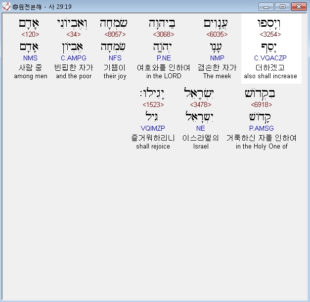 히브리어구약BHS,19 וְיָסְפוּ עֲנָוִים בַּיהוָה שִׂמְחָה וְאֶבְיֹונֵי אָדָם בִּקְדֹושׁ יִשְׂרָאֵל יָגִילוּ׃