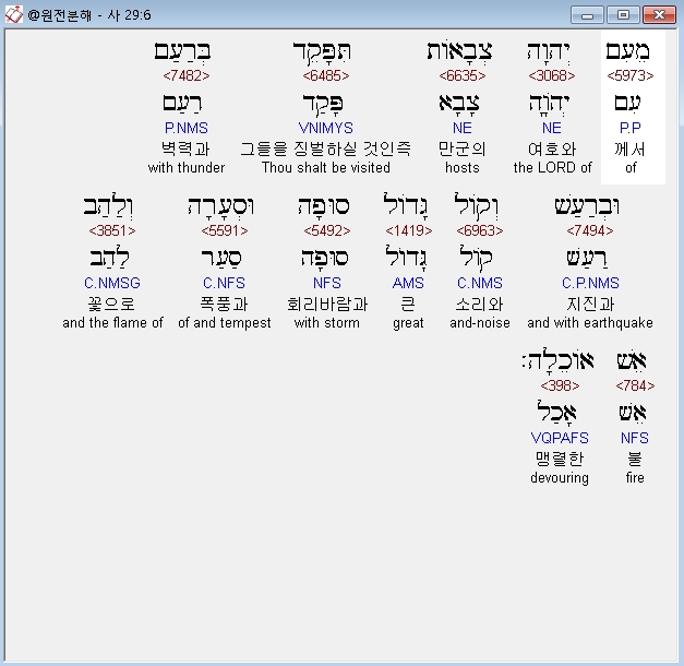 히브리어구약BHS,6 מֵעִם יְהוָה צְבָאֹות תִּפָּקֵד בְּרַעַם וּבְרַעַשׁ וְקֹול גָּדֹול סוּפָה וּסְעָרָה וְלַהַב אֵשׁ אֹוכֵלָה׃