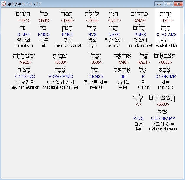 히브리어구약BHS,7 וְהָיָה כַּחֲלֹום חֲזֹון לַיְלָה הֲמֹון כָּל־הַגֹּויִם הַצֹּבְאִים עַל־אֲרִיאֵל וְכָל־צֹבֶיהָ וּמְצֹדָתָהּ וְהַמְּצִיקִים לָהּ׃