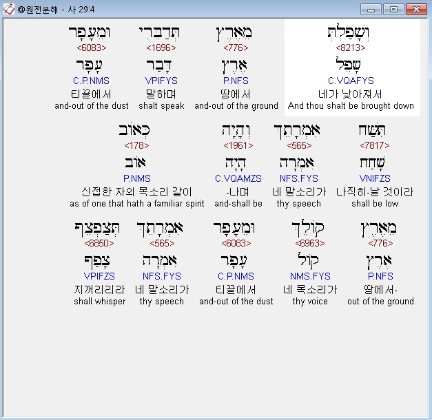 헬라어구약Septuagint,4 και ταπεινωθησονται οι λογοι σου εις την γην και εις την γην οι λογοι σου δυσονται και εσται ως οι φωνουντες εκ της γης η φωνη σου και προς το εδαφος η φωνη σου ασθενησει