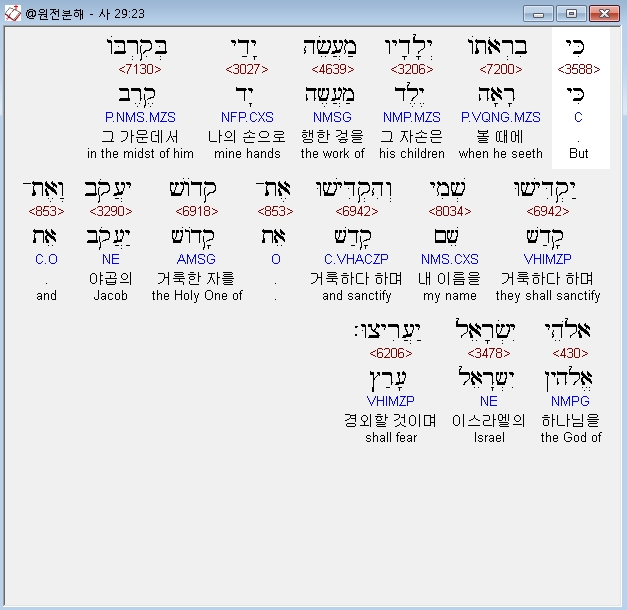 영어NASB,23 But when he sees his children, the work of My hands, in his midst, They will sanctify My name; Indeed, they will sanctify the Holy One of Jacob, And will stand in awe of the God of Israel.