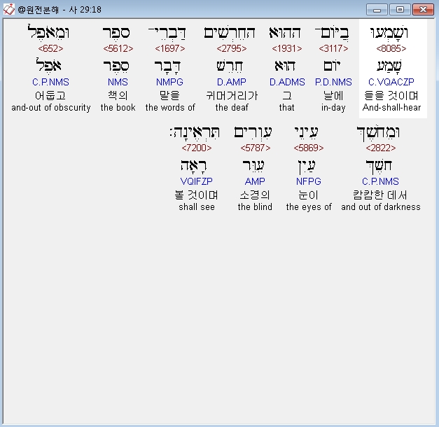 히브리어구약BHS,18 וְשָׁמְעוּ בַיֹּום־הַהוּא הַחֵרְשִׁים דִּבְרֵי־סֵפֶר וּמֵאֹפֶל וּמֵחֹשֶׁךְ עֵינֵי עִוְרִים תִּרְאֶינָה׃