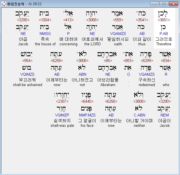 히브리어구약BHS,22 לָכֵן כֹּה־אָמַר יְהוָה אֶל־בֵּית יַעֲקֹב אֲשֶׁר פָּדָה אֶת־אַבְרָהָם לֹא־עַתָּה יֵבֹושׁ יַעֲקֹב וְלֹא עַתָּה פָּנָיו יֶחֱוָרוּ׃