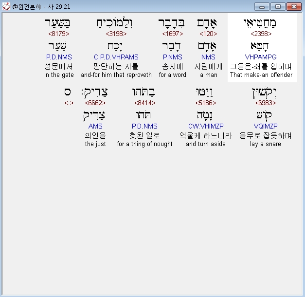 히브리어구약BHS,21 מַחֲטִיאֵי אָדָם בְּדָבָר וְלַמֹּוכִיחַ בַּשַּׁעַר יְקֹשׁוּן וַיַּטּוּ בַתֹּהוּ צַדִּיק׃ ס