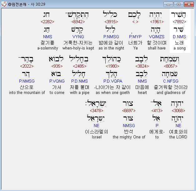 히브리어구약BHS,29 הַשִּׁיר יִהְיֶה לָכֶם כְּלֵיל הִתְקַדֶּשׁ־חָג וְשִׂמְחַת לֵבָב כַּהֹולֵךְ בֶּחָלִיל לָבֹוא בְהַר־יְהוָה אֶל־צוּר יִשְׂרָאֵל׃
