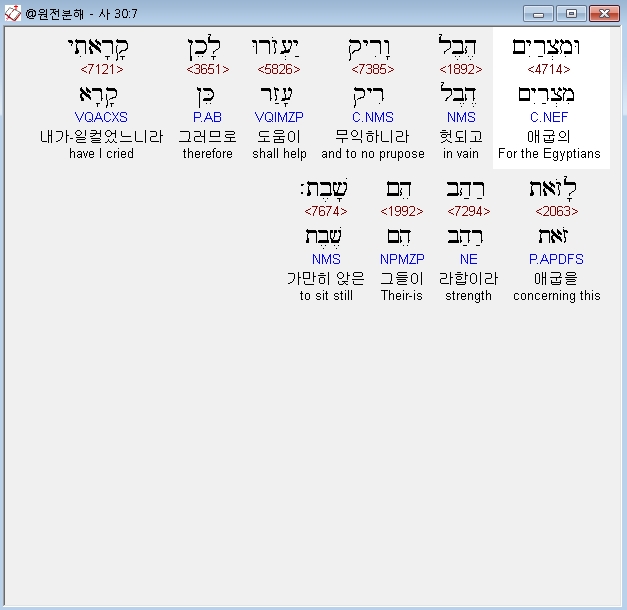 히브리어구약BHS,7 וּמִצְרַיִם הֶבֶל וָרִיק יַעְזֹרוּ לָכֵן קָרָאתִי לָזֹאת רַהַב הֵם שָׁבֶת׃