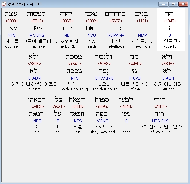 히브리어구약BHS,1 הֹוי בָּנִים סֹורְרִים נְאֻם־יְהוָה לַעֲשֹׂות עֵצָה וְלֹא מִנִּי וְלִנְסֹךְ מַסֵּכָה וְלֹא רוּחִי לְמַעַן סְפֹות חַטָּאת עַל־חַטָּאת׃