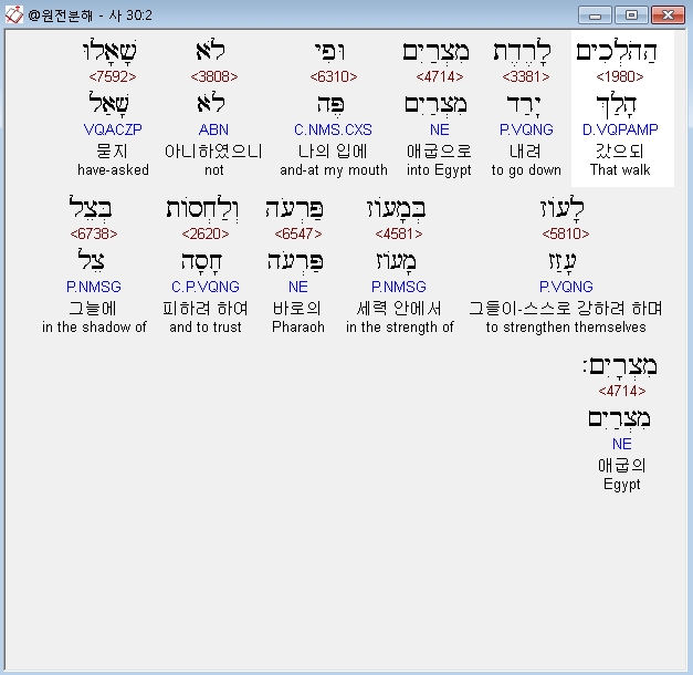 히브리어구약BHS,2 הַהֹלְכִים לָרֶדֶת מִצְרַיִם וּפִי לֹא שָׁאָלוּ לָעֹוז בְּמָעֹוז פַּרְעֹה וְלַחְסֹות בְּצֵל מִצְרָיִם׃