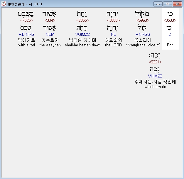 히브리어구약BHS,31 כִּי־מִקֹּול יְהוָה יֵחַת אַשּׁוּר בַּשֵּׁבֶט יַכֶּה׃