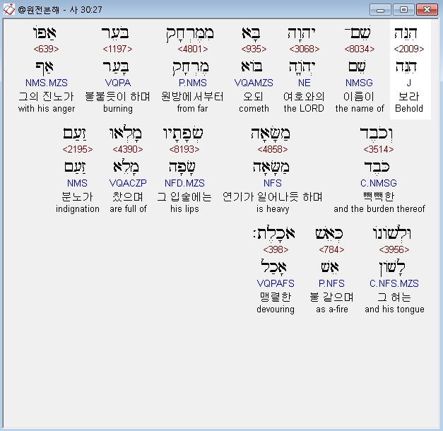 히브리어구약BHS,27 הִנֵּה שֵׁם־יְהוָה בָּא מִמֶּרְחָק בֹּעֵר אַפֹּו וְכֹבֶד מַשָּׂאָה שְׂפָתָיו מָלְאוּ זַעַם וּלְשֹׁונֹו כְּאֵשׁ אֹכָלֶת׃