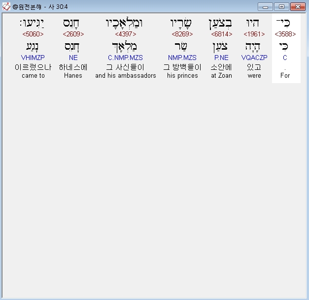 히브리어구약BHS,4 כִּי־הָיוּ בְצֹעַן שָׂרָיו וּמַלְאָכָיו חָנֵס יַגִּיעוּ׃
